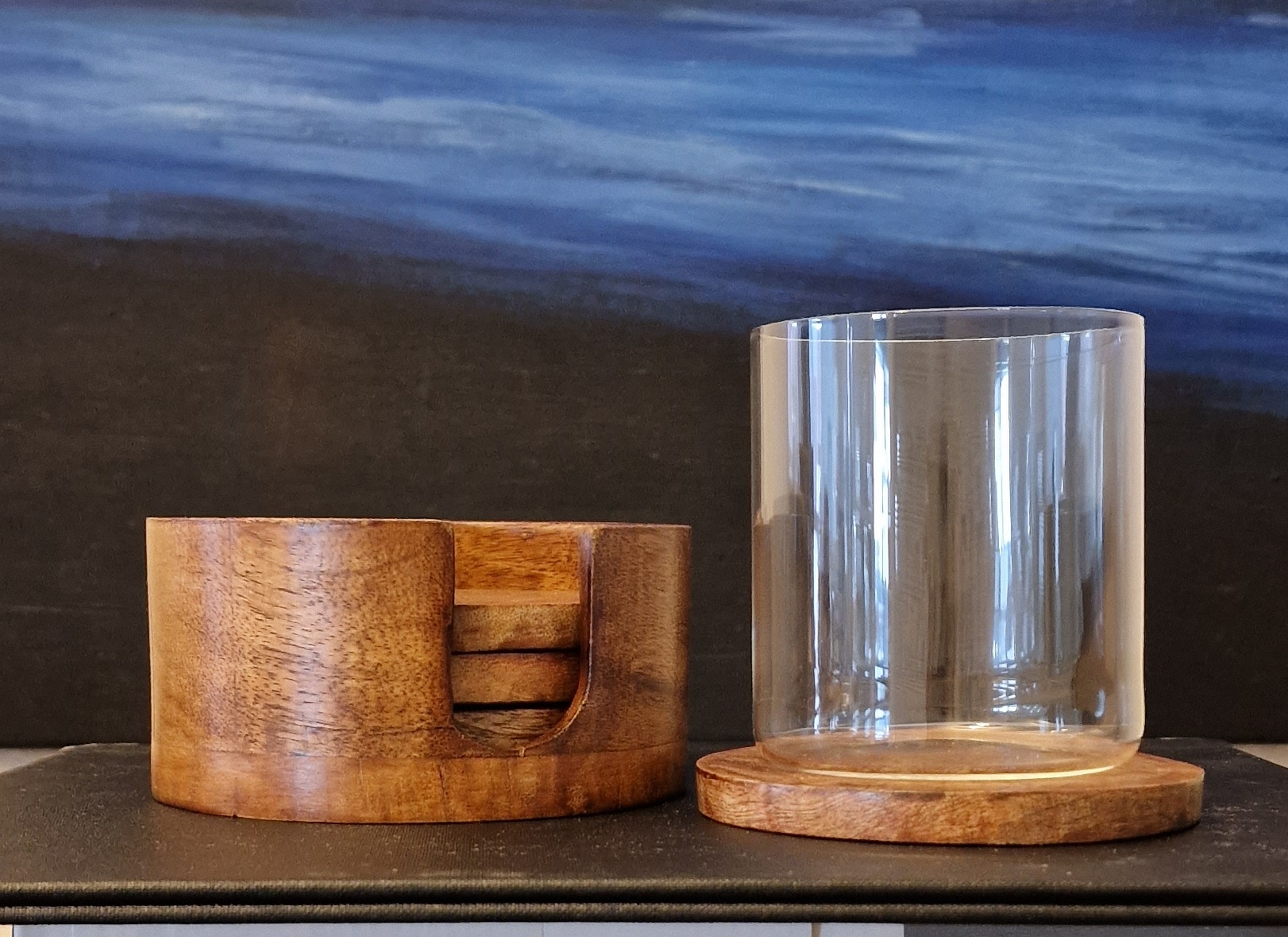 Underläggsset och hållare av mangoträ, en harmonisk blandning av naturlig elegans och praktisk funktionalitet. Skapad för att höja din mat- och underhållningsupplevelse.